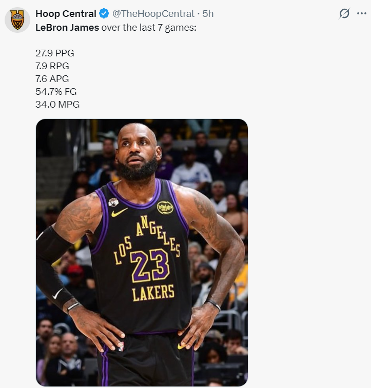 勒布朗年满41岁后他七场比赛里只有一场没有超过25+,其中还有三场30+,如此努力的老头真的应该背锅吗?这7场比赛湖人3胜4负战绩的确不佳。